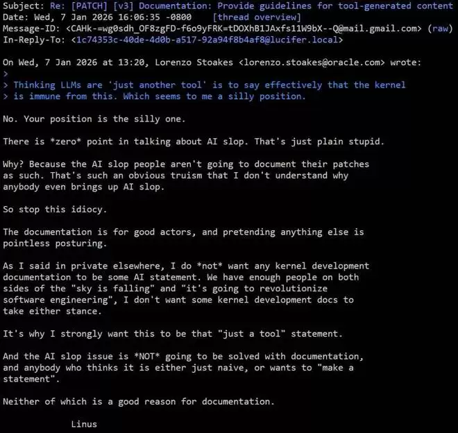1 月 7 日,在 Linux 内核开发人员讨论如何规范 AI 生成的 Linux 内核时,Torvalds 忍不住插话进来:
