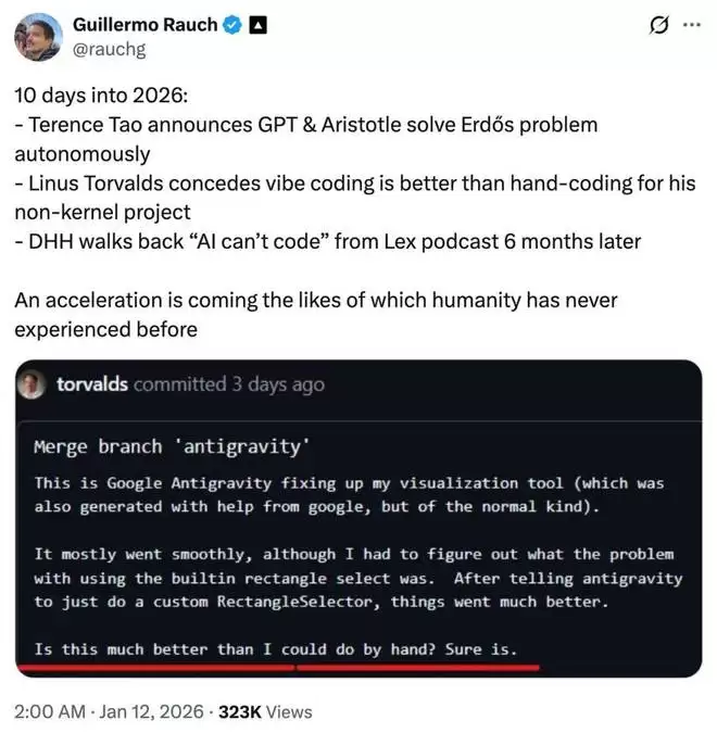 云开发平台 Vercel CEO Guillermo Rauch 列举了 2026 开年发生的几件大事,其中 Torvalds 在其非内核项目中使用氛围编程与陶哲轩宣布 GPT 和 Aristotle 自主解决 Erdős 问题、编程大神 DHH 收回在 Lex 播客中发表的「AI 不会编程」的言论等并列。
