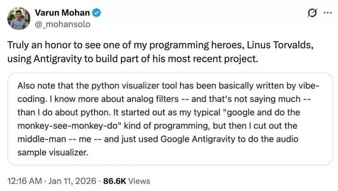Antigravity 创建者、谷歌 DeepMind 工程师 Varun Mohan 视 Torvalds 为自己的编程偶像之一,此次对其能够在最新的项目中使用该 AI 编程工具感到莫大的荣幸。