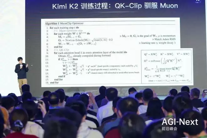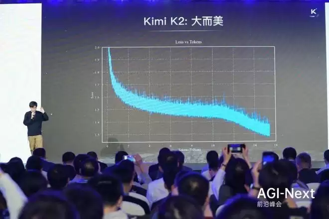 相比于统治了业界十年的 Adam 优化器,这个全新的二阶优化器实现了「两倍的 Token 效率提升」。这意味着,达到同样的智能水平,它只需要一半的数据量。为了解决二阶优化器常见的训练不稳定问题,团队引入了创新的「QK Clip」机制,动态调整梯度。杨植麟指着屏幕上一张完全平稳下降、没有任何毛刺(spike)的 Loss 曲线图,动情地说道:「这张图是我 2025 年见过的最美的东西,它是一个完全平稳下降的 Loss 曲线。当你有一个优雅的方法,就可以得到一个优雅的结果。」