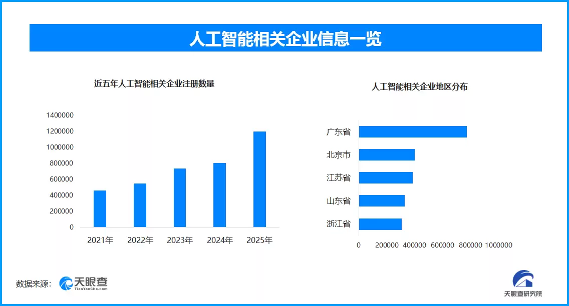 天眼查专业版工商信息数据显示,截至当前,我国现存且处于在业、存续状态的人工智能相关企业已超过500万家。其中,仅2025年新增注册的相关企业就超过120.2万余家。从企业注册数量趋势来看,近五年间,人工智能相关企业的注册数量呈现出逐年增长的态势,并在2025年达到峰值。