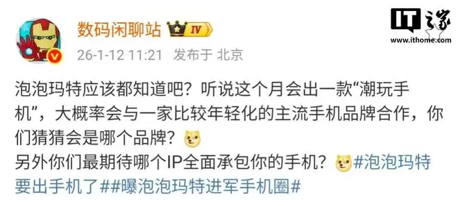 IT之家注意到,今日早些时候,有博主爆料称,“听说”泡泡玛特本月将推出一款“潮玩手机”,大概率会与一家定位更年轻化的主流手机品牌合作。不过,该博主并未透露具体厂商,而是将悬念留给了评论区。