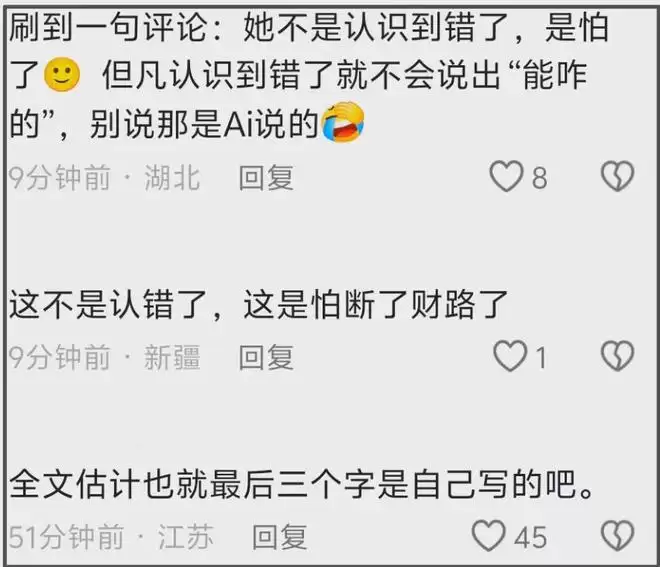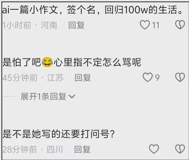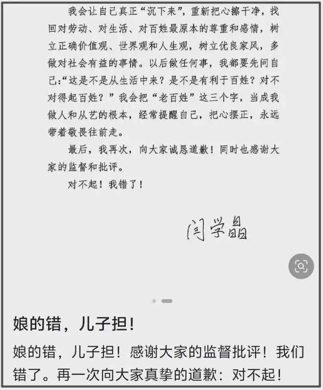 在网友看来,闫学晶母子二人道歉并不诚恳,所谓道歉信充满ai味,怀疑全文只有签名三个字是闫学晶自己写的。