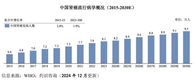 透明细胞肾细胞癌作为肾癌最主要的病理亚型,占所有肾癌病例的75%-80%,是泌尿系统中极具侵袭性的恶性肿瘤之一。其患者规模正不断增长,据灼识咨询数据显示,2015年到2024年,中国肾癌的发病人数已从6.6万人增长至8.1万人,复合年增长率为2.0%,且预计将以1.9%的复合年增长率增长到2030年的9.3万人。