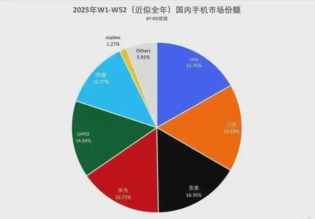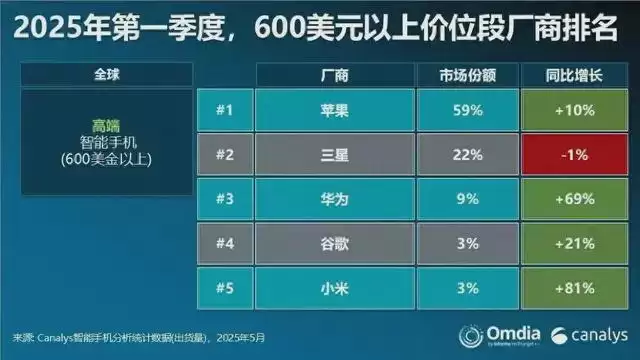 Canalys发布的2025年第一季度数据显示,苹果以59%的市场份额绝对主导,三星占22%,华为虽受外部环境制约,仍以9%稳居前列,而荣耀则彻底跌出前五,几乎在高端市场无声无息。