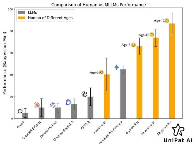 UniPatAI发布的技术论文显示,该评测集首轮测试的结果中,当前绝大多数顶尖多模态大模型的视觉任务表现,都要显著低于 3 岁儿童水平,仅仅有一款模型勉强超过3岁基线。