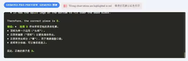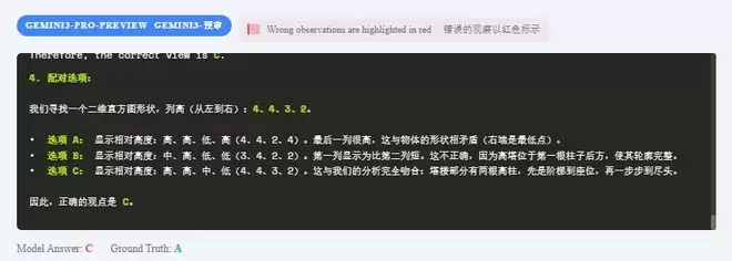 Gemini3在这里将图形高度按照数字进行标记,但错误将右侧竖列后排为4的积木忽略,最终计为前排平台的2,因此得到了错误答案C。
