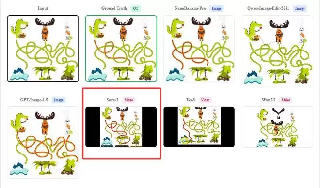 美中不足的是,Sora2也仅画对了鳄鱼这一条线,而其他模型则是一条线也没有成功。但或许未来通过让模型进行绘画、临摹等方式进行推理,可以恢复大模型的文字推理所缺失的能力。