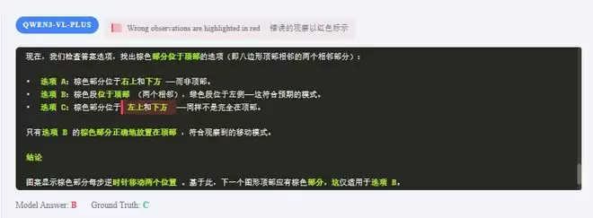 阿里千问在将图形拆解成8等分后,成功判断出棕色部分应该在顶部,然而却将C选项“看花眼”