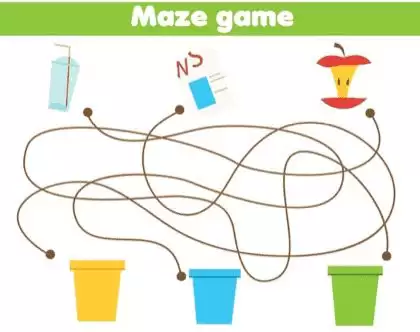 比如在BabyVision-Mini中一道垃圾分类连线题,要求将"塑料杯""废报纸""苹果核"分别通过路径连线到对应颜色的垃圾桶,正确答案为A-蓝、B-黄、C绿。