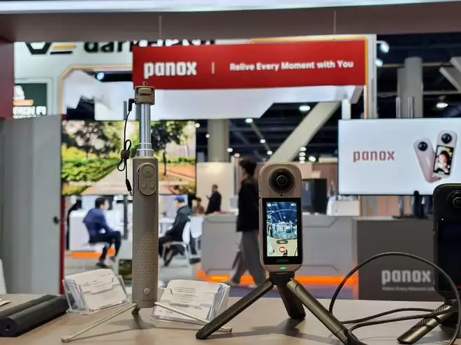另一家来自深圳的厂商Panox则带来了他们的全新产品——Panox V5。作为全景相机,它与市面上主流的全景相机在外观上大差不差,优点是这个形态确实足够成熟,缺点则是比较难做出自己的风格和独特性。要说它最大的亮点,还得是内置安卓系统,这使得Panox V5能够直接在机内完成视频拼接。