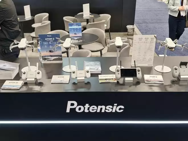 无人机厂商Potensic博坦并没有把自家的无人机新品放在C位,而是把遥控器摆在最显眼的位置——PTD-1 一体化带屏遥控器。工作人员上来就一句话:不用再接手机、也不用再找线,开机、连上、起飞,一气呵成。