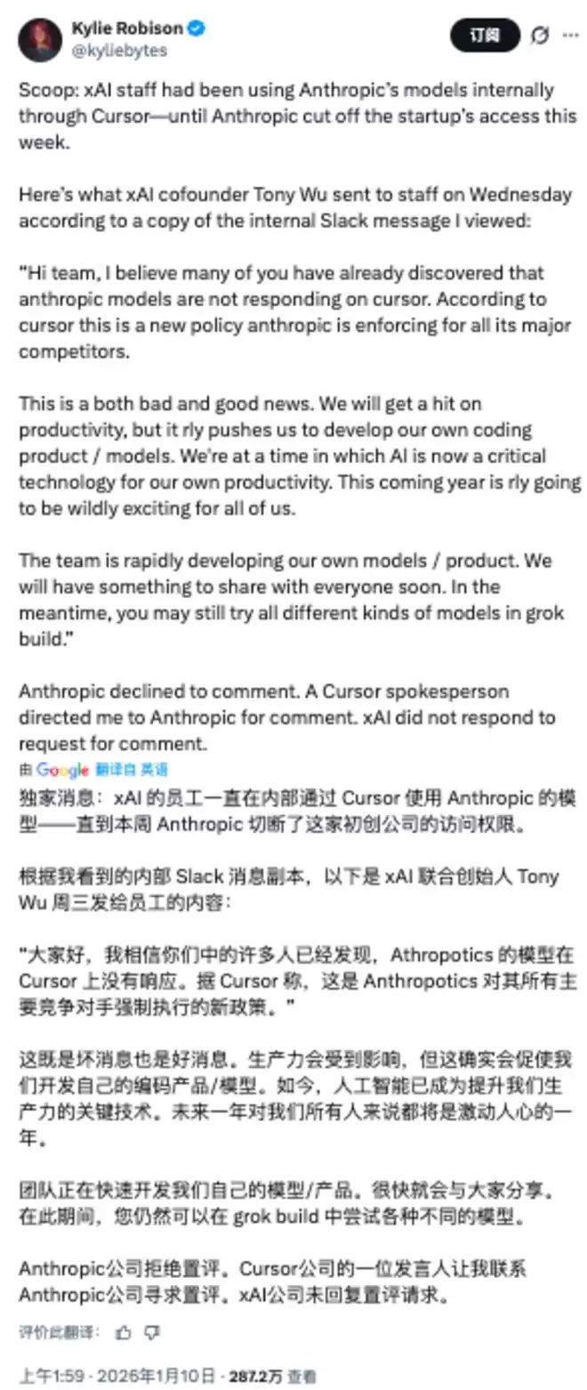 1月10日,罗宾逊在社交平台X上发帖称,马斯克旗下大模型公司xAI的员工一直在通过第三方编程助手Cursor使用Anthropic的模型,而后者突然切断了Cursor的访问权限。
