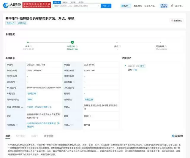中国一汽在车辆控制技术领域实现了一项重要突破,其提交的“基于生物-物理耦合的车辆控制方法、系统、车辆”专利已正式对外公开。这一创新成果标志着脑机接口技术与汽车产业的融合迈入了全新阶段。