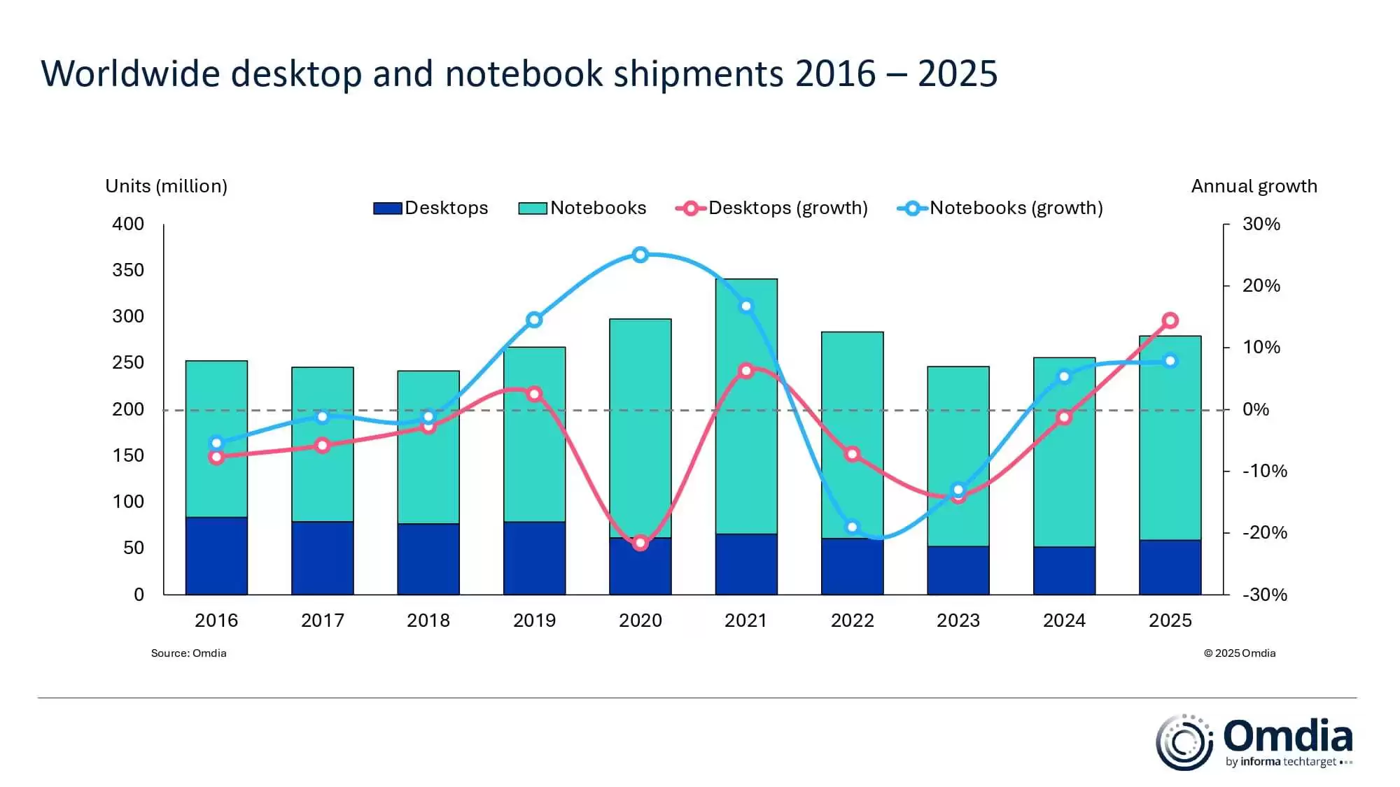 1月12日,业界知名的数据调研机构Omdia公布了2025年第四季度及全年全球PC市场研究报告。