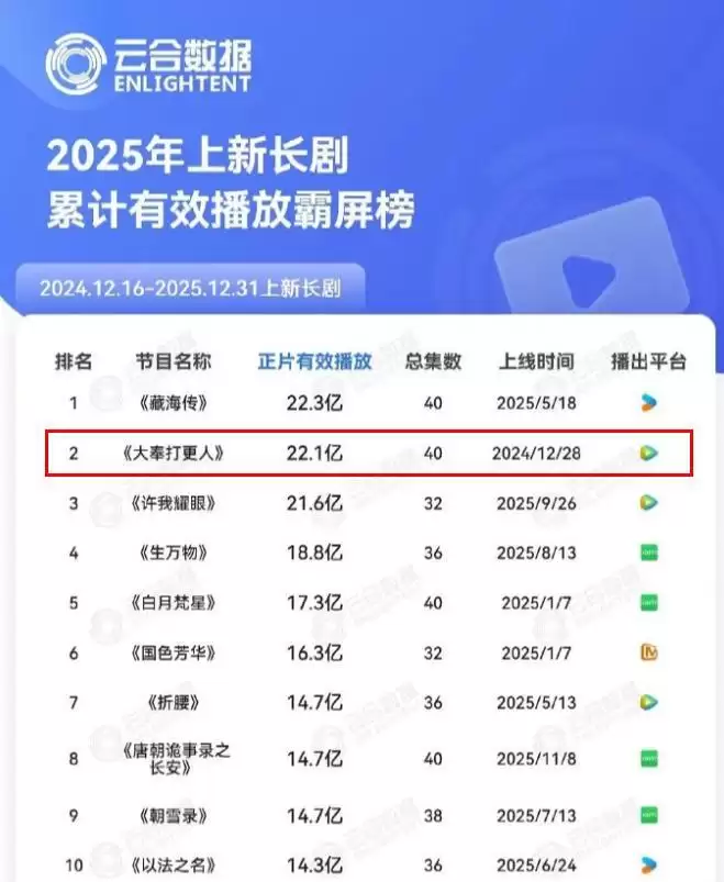 《大奉打更人》迎来大结局后,有很多网友都在“嘲笑”王鹤棣,毕竟《大奉打更人》取得的成绩不理想,但这部剧真的没有取得亮眼的成绩吗?近日,最新发出2025年上新长剧累积有效播放霸屏榜,共有20部电视剧入选。