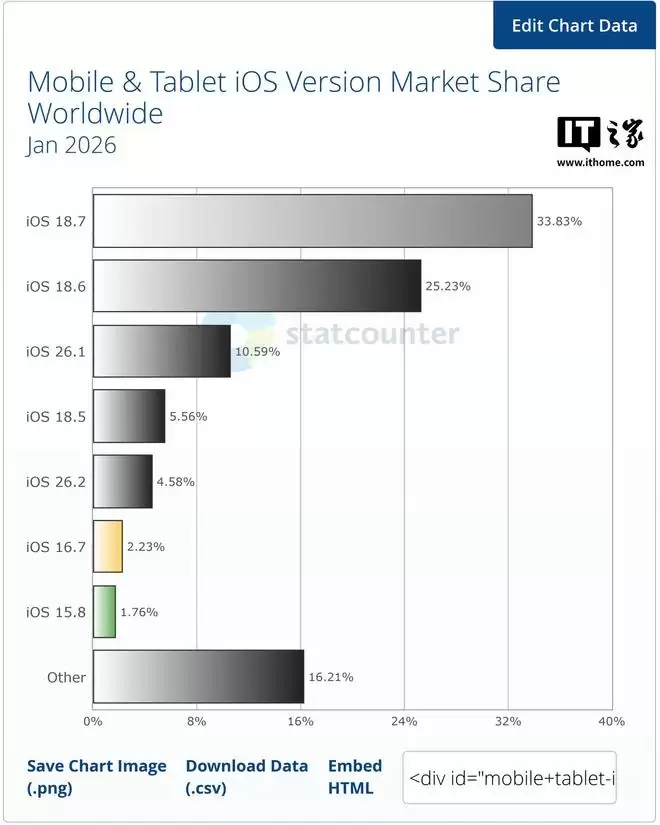 这意味着,StatCounter在统计iOS 26市场占比时,很可能将大量运行iOS 26的Safari用户错误地归类到了旧的系统版本中。真正被计入iOS 26统计的,几乎只剩下使用第三方浏览器的用户。这直接导致了iOS 26的升级率被严重低估。
