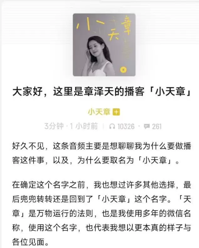 章泽天以多年使用的网络昵称“小天章”为名,在小宇宙等平台推出个人播客节目。