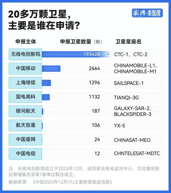 根据公开资料,该机构于2025年12月30日在雄安新区完成注册,在注册前一天的12月29日,便以机构名义向国际电信联盟提交了近20万颗卫星的频轨申请。上海社会科学院信息研究所副所长丁波涛及头部商业卫星公司人士指出,这意味着卫星频轨资源申请已上升至国家战略层面。