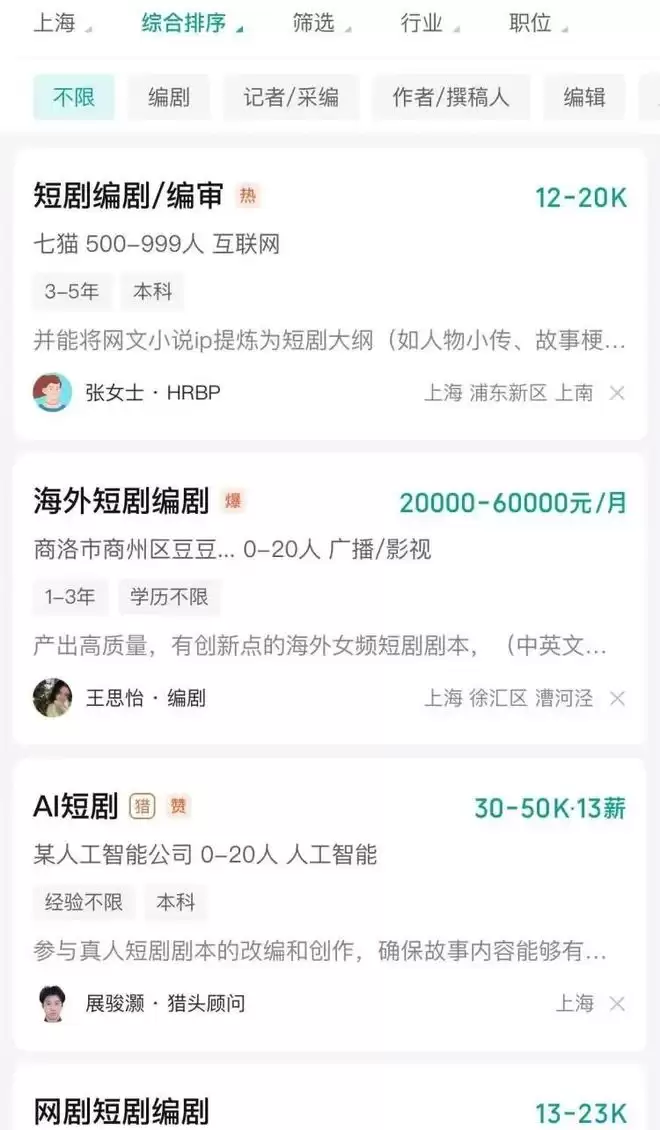 招聘平台出现了不少短剧编剧的岗位