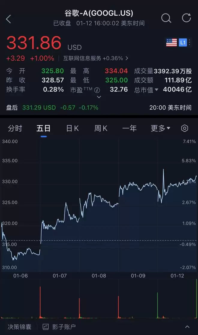 谷歌自2025年11月发布Gemini 3后股价持续爬升,其市值在上周自2019年以来首次超越苹果公司的3.8万亿美元,上到4万亿美元。这也使其成为继英伟达、微软、苹果之后第四家达到这一超高市值的上市公司。