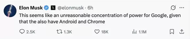 消息一经发布,马斯克跳出来在社交平台X直言:“考虑到谷歌旗下还拥有安卓和Chrome浏览器,这种权力集中似乎有些不合理。”