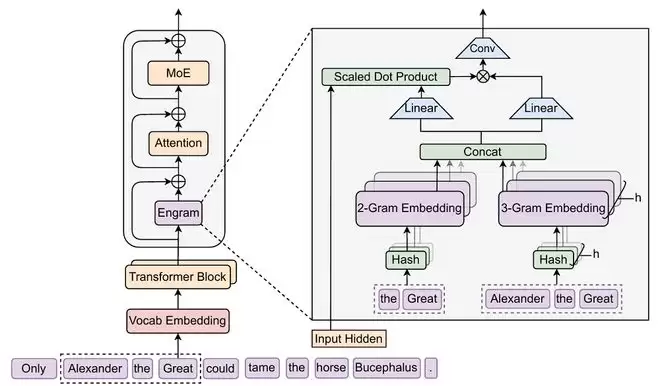 下图是Engram的基本架构,通俗地说,Engram就是给Transformer加个外接记忆库,并把当前token附近的一小段内容,用快速、省参数的方式,去一个超大的静态记忆表里查到对应内容。