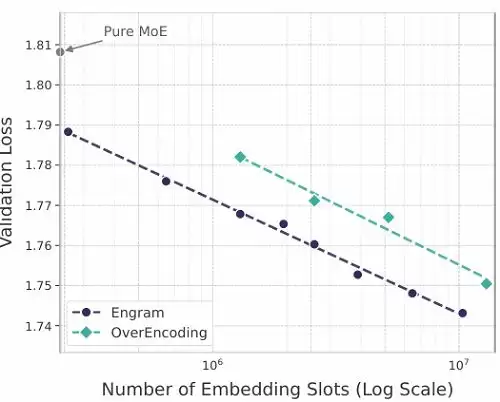 实验发现,在MoE主干网络不变的情况下,附加Engram表。结果显示,增加记忆槽位数量能持续、稳定地降低验证损失。