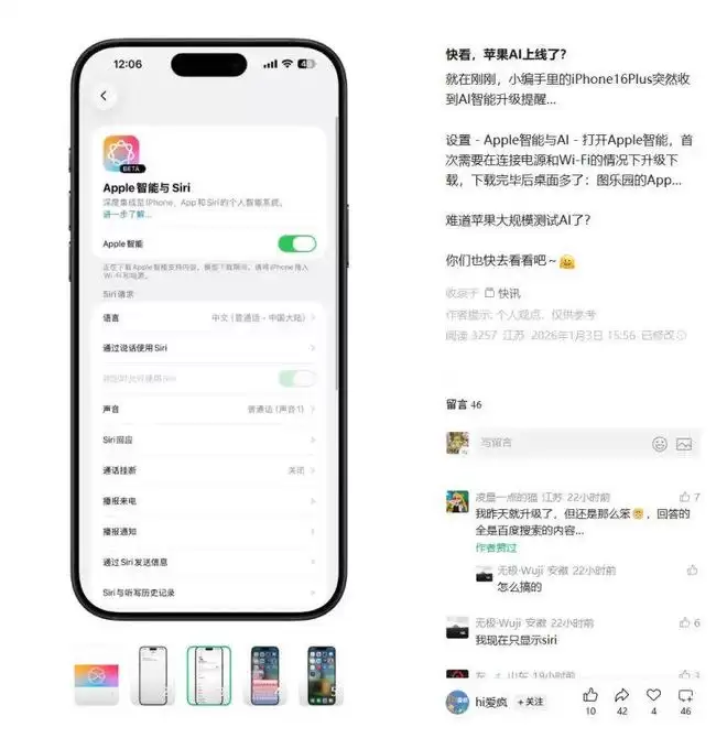 在苹果AI宣布大进展的同时,国内用户也在等待苹果AI国行版的上线。就在本月,有博主发文称,其国行版iPhone 16 Plus收到了“Apple智能与Siri”相关测试提示,随后“苹果国行AI灰测”话题迅速引发网友热议。