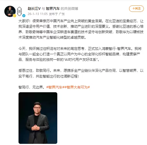 1月13日消息,原比亚迪高管赵长江通过社交媒体正式宣布,他已加入奇瑞集团旗下的智界汽车。其微博认证信息现已更新为:智界汽车执行董事及执行副总裁。