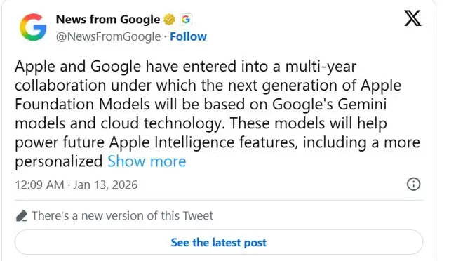 根据媒体此前1月12日援引的知情人士透露的消息,苹果公司(Apple)将在一项多年期协议下,把谷歌的 Gemini AI大模型用于今年推出的新版Siri AI语音助手,并且谷歌表示其模型也将为其他的Apple Intelligence核心功能提供技术支持;与此同时,Apple Intelligence仍会在消费电子设备端以及通过 Private Cloud Compute 运行,并强调会维持一 贯的隐私标准。