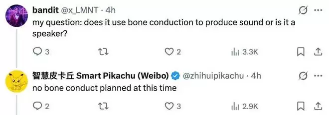 在相关评论区,这位博主进一步透露了关于这款设备的更多信息。例如,当被问及“它的发声是通过骨传导,还是内置了扬声器?”时,他回复道:“目前没有采用骨传导技术的计划。”