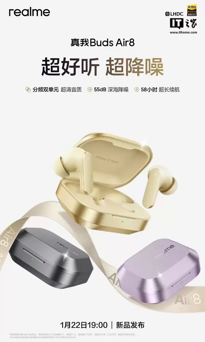 IT之家 1月13日消息,realme真我手机官方微博宣布,全新真我 Buds Air8 耳机将于1月22日晚7点正式亮相。