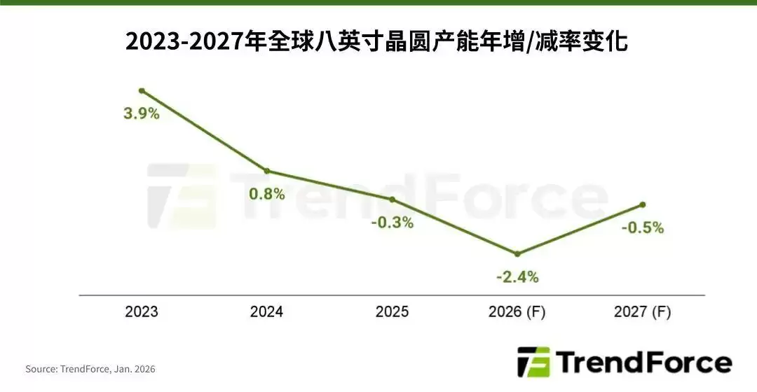 在供给侧,台积电已于2025年正式启动八英寸产能的逐步削减,目标是在2027年实现部分厂区的全面停产。三星同样在2025年开启了八英寸减产计划,其态度更为坚决。集邦咨询预计,2025年全球八英寸产能将因此缩减约0.3%,正式进入负增长阶段。即便2026年有中芯国际、世界先进等厂商计划小幅扩产,其增量仍无法完全抵消两大龙头减产的影响,预计产能年降幅度将扩大至2.4%。