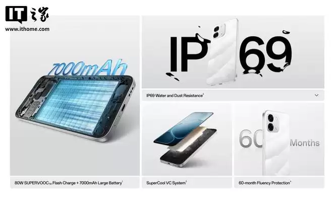 此外,这款手机还通过了IP69级别的防尘防水认证。影像系统方面,它后置5000万像素主摄以及200万像素黑白辅助镜头,前置则为1600万像素摄像头。充电方面支持80W SUPERVOOC闪充,并兼容33W PPS以及13.5W PD通用快充协议。以下是IT之家附上的最新渲染图: