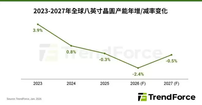 从供应端来看,晶圆代工行业两大巨头台积电与三星电子,均从2025年开始主动缩减8英寸产能,转而聚焦在盈利能力更强的12英寸平台。其中台积电的目标是在2027年前实现部分厂区的全面停产。受此影响,2025年全球8英寸产能已出现0.3%的下降,预计今年产能跌幅将扩大至2.4%。