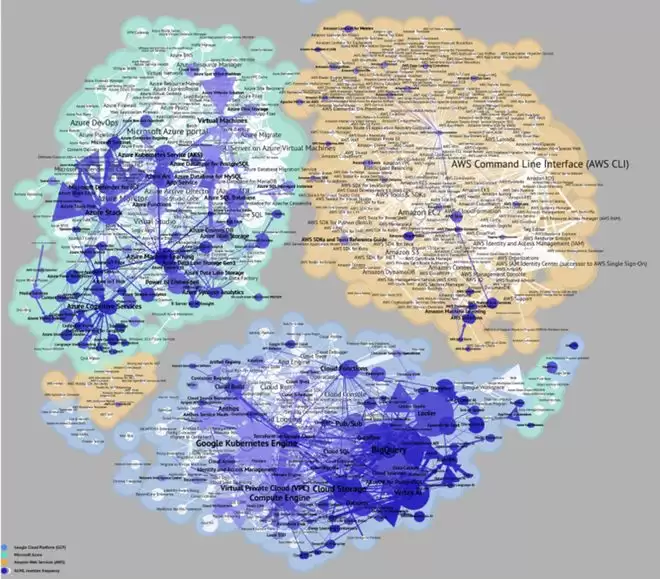 (图:云AI堆栈) 注:图中展示了亚马逊网络服务、微软Azure和谷歌云平台中云平台产品和服务之间的结构性互联。线条粗细表示引用频率,指示不同产品和服务之间联系的强度。
