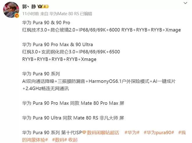 华为Pura 90 Pro Max是为了那些既要又要的用户准备的,拥有Mate系列顶级的屏幕素质,补齐了续航短板,影像规格也处于行业第一梯队。华为Pura 90 Ultra是纯粹的技术秀场,玄武钢化昆仑玻璃3.0、Mate 80 RS同款屏幕、以及可能高达7000mAh的恐怖续航,这些配置让它不仅是一部手机,更是一个移动的影像工作站。
