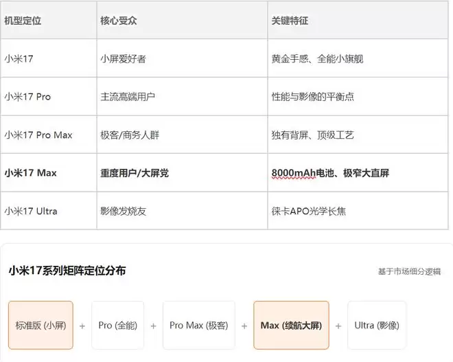 小米构建了标准版、Pro版、Pro Max版、Ultra版本,以及今年上半年即将登场的小米17 Max四款机型。
