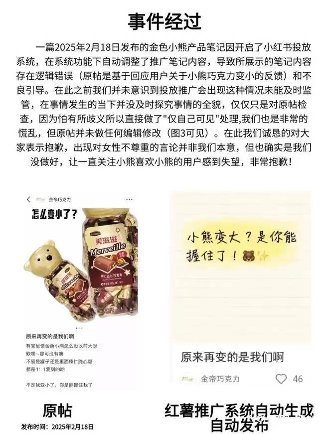 该负责人进一步指出,团队理解网友的情绪。他们认识到,“金色小熊”在品牌与其消费者的认知里是中性的品牌名称,已经沿用了20多年。然而,当内容通过平台推广触及更广泛的用户时,部分网友会结合小红书社区内“熊”及其表情包被用作女性胸部的谐音和代指的语境,对内容产生了不同的解读,从而造成了误解和伤害。品牌方对此表示深深的歉意。