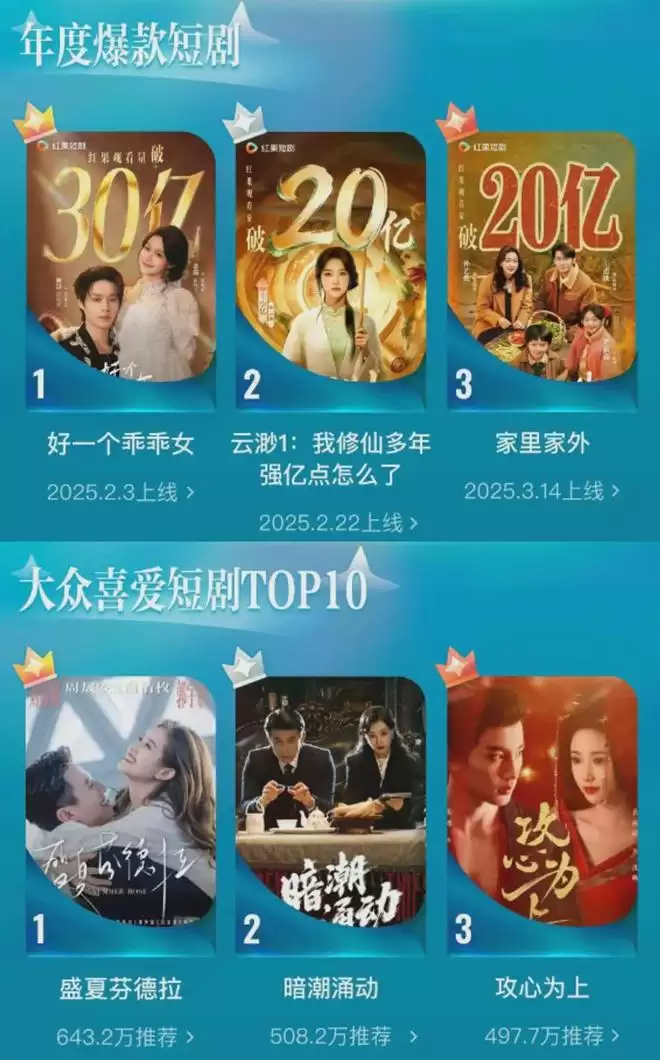 近日,红果短剧年度大赏公布年度爆款短剧、大众最喜爱短剧TOP10名单,《盛夏芬德拉》《暗潮涌动》《家里家外》《好一个乖乖女》《一品布衣》等现象级爆款入选。从言情甜宠到古装权谋,横亘多个题材的代表作品以令人咋舌的播放数据和口碑定义了行业新高度,也折射出2025年短剧产业火热表象下深刻的结构性变迁。