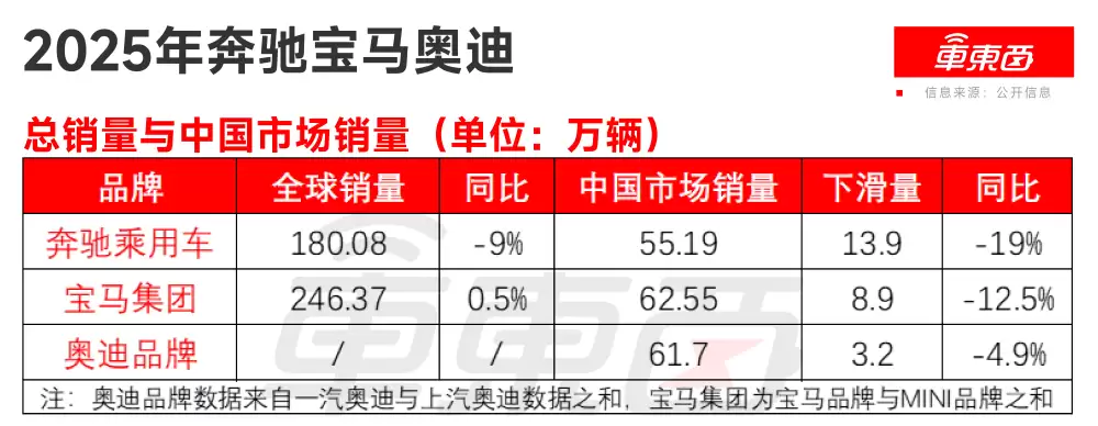 从区域市场表现来看,奔驰在亚洲市场整体下滑16%,其中中国市场的销量萎缩贡献了主要降幅;宝马在亚洲的销量同比下滑9.3%,中国市场占比超过七成;奥迪虽未公布全球数据,但其在华的销量变化已能说明问题。值得注意的是,奔驰在2025年第四季度中国销量同比增长7%,显示出一定的复苏迹象,而宝马同期销量则同比下滑15.9%。