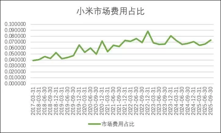 要理解小米的舆论困局,需从其内部预算分配机制的调整说起。小米以手机业务起家,凭借高性价比产品积累了庞大的“米粉”群体。然而,随着手机行业增速放缓和AIoT业务的扩张,使得营销策略也随之调整。过去,小米的市场费用占营收比一直低于5%,在硬件销售企业中堪称“节俭”;即便后来逐渐上升至7%左右,仍低于同类企业10%的平均水平。