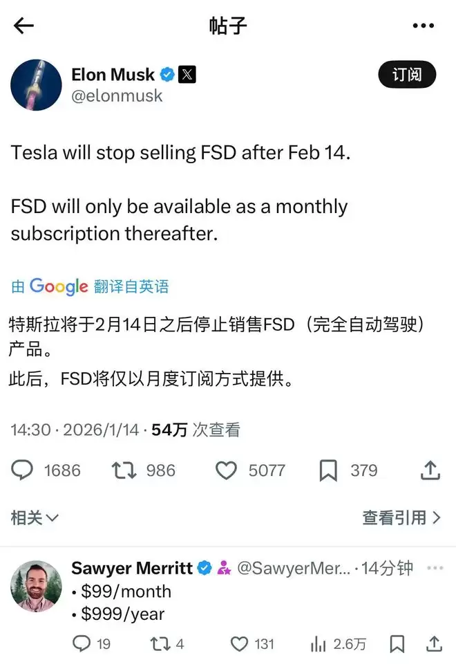1月14日,特斯拉首席执行官埃隆·马斯克在社交平台X上发文宣布,公司将于2月14日之后停止销售完全自动驾驶(FSD)能力套件。此后,FSD功能将仅以月度订阅的形式向用户提供。