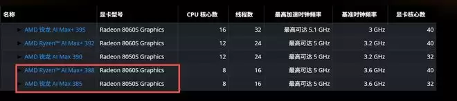 ●AI Max系列中,集显是最大的亮点之一。起步就是32CU的Radeon 8050S,高配则是40CU的满血版Radeon 8060S——这货的性能,在功率给足、性能释放充分的情况下,在3Dmark Time Spy中,显卡分数跑到了12000分!接近RTX 5060!而这还不是重点,重点是,AMD新推出的AI Max+ 388(搭载Radeon 8060S)是8核16线程的处理器,有望大幅度降低Radeon 8060S集显轻薄本的价格,甚至,再往下还有AI Max 385,虽然搭载的是Radeon 8050S集显,但只要价格能更低,牺牲一些集显性能也不是不能接受。
