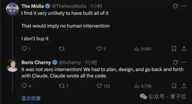 不是说无人类干预,Claude Code负责人Boris Cherny确认,还需要人类来规划、设计、让AI反复尝试。