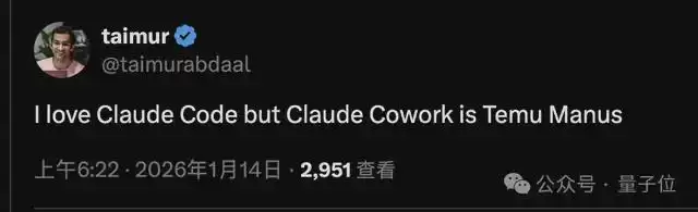 也有人认为目前Claude Cowork还比较早期,算是“拼多多版”Manus。