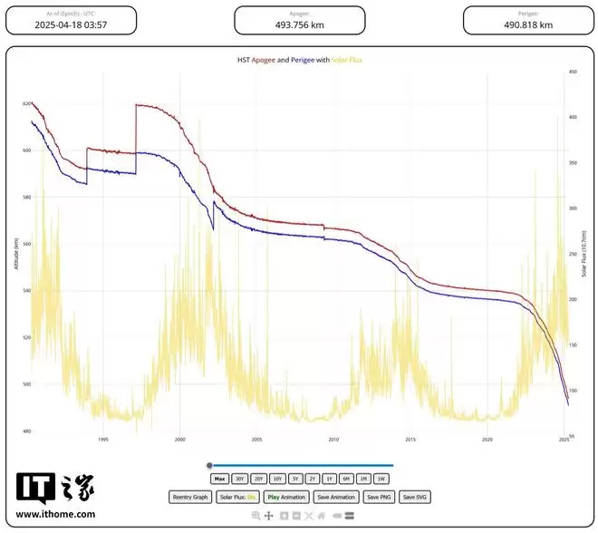 文章透露,哈勃发射时的初始轨道高度约为360英里(约579公里),而目前已跌落至约326英里(约525公里),且下降趋势仍在持续。