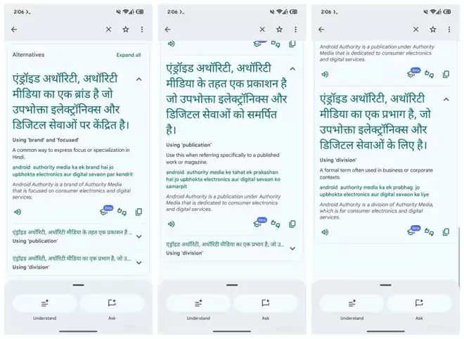 该媒体还指出,谷歌翻译为补充背景信息,已着手测试“理解”(Understand)和“提问”(Ask)按钮,而“显示替代译法”极有可能与这两个功能打包推出,形成一套完整的AI翻译辅助工具链。