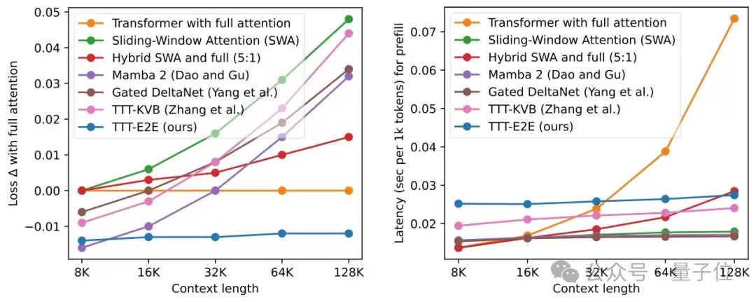 在3B参数模型的测试中,TTT-E2E在128K上下文长度下的测试损失与全注意力Transformer持平甚至更优,而Mamba 2、Gated DeltaNet等同类模型在长文本场景下性能均出现明显下滑;